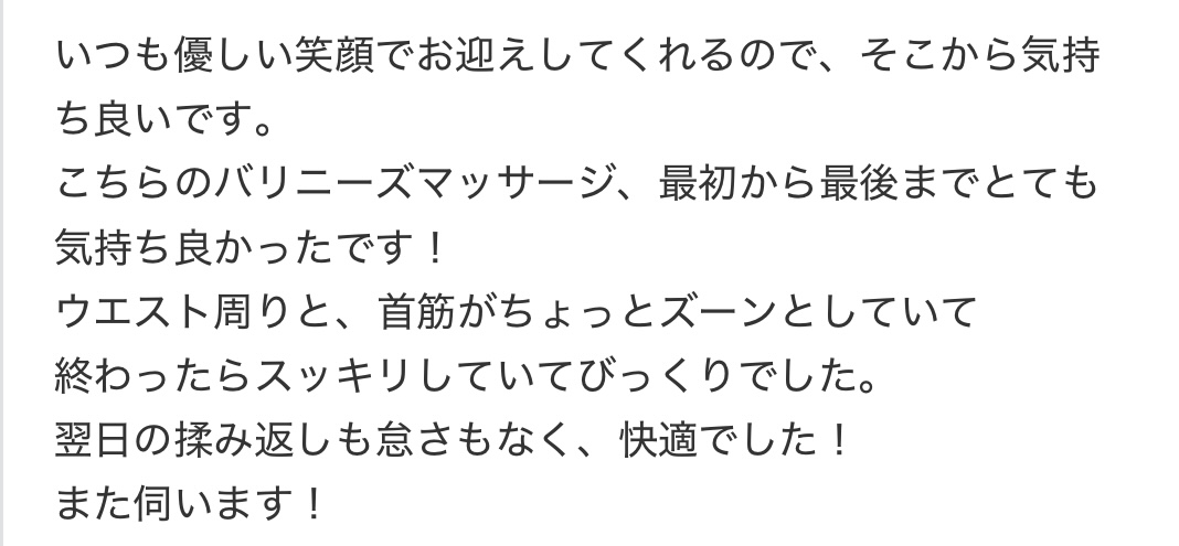お客様の声⑦ 2026 1/30 お客様の声 2026年1月30日 施術メニュー:バリニーズマッサージいつも優しい笑顔でお迎えしてくれるので、そこから気持ち良いです。こちらのバリニーズマッサージ、最初から最後までとても気持ち良かったです。ウエスト周りと、首筋がちょっとズーンとしていて、終わったらスッキリしていてびっくりでした。翌日の揉み返しも怠さもなく、快適でした!また伺います!40代女性 ▽▼▽ ご予約/MENUはこちら ▽▼▽ お客様の声 ドライヘッドスパ バリニーズマッサージ 伊勢崎アイブロウ 伊勢崎ドライヘッドスパ 伊勢崎ハンドマッサージ 伊勢崎バリニーズマッサージ 伊勢崎フットマッサージ 伊勢崎ヘッドスパ 伊勢崎ヘッドマッサージ 伊勢崎リラクゼーション、伊勢崎リラク 伊勢崎姿勢改善 伊勢崎巻き肩改善 伊勢崎眼精疲労 伊勢崎肩こり 伊勢崎食いしばり 伊勢崎首こり 群馬アイブロウスタイリング 群馬ドライヘッドスパ 群馬ハンドマッサージ 群馬バリニーズマッサージ 群馬フットマッサージ 群馬ヘッドスパ 群馬ヘッドマッサージ 群馬マッサージ 群馬リラクゼーション、群馬リラク 群馬眉WAX 群馬食いしばり この記事が気に入ったら フォローしてね! Follow Me URLをコピーしました! URLをコピーしました! 【 1等無料 】ハズレなし!新春お年玉くじ 2月営業日のお知らせ 関連記事 お客様の声⑥ 2025年10月30日 お客様の声⑤ 2025年8月2日 お客様の声④ 2024年1月1日 お客様の声③ 2023年12月30日 お客様の声② 2023年12月30日 お客様の声① 2023年12月30日 SNS \最新情報等はSNSで発信中/ Instagram 公式LINE コメント コメントする コメントをキャンセルコメント ※ 名前 ※ メール ※ サイト 次回のコメントで使用するためブラウザーに自分の名前、メールアドレス、サイトを保存する。